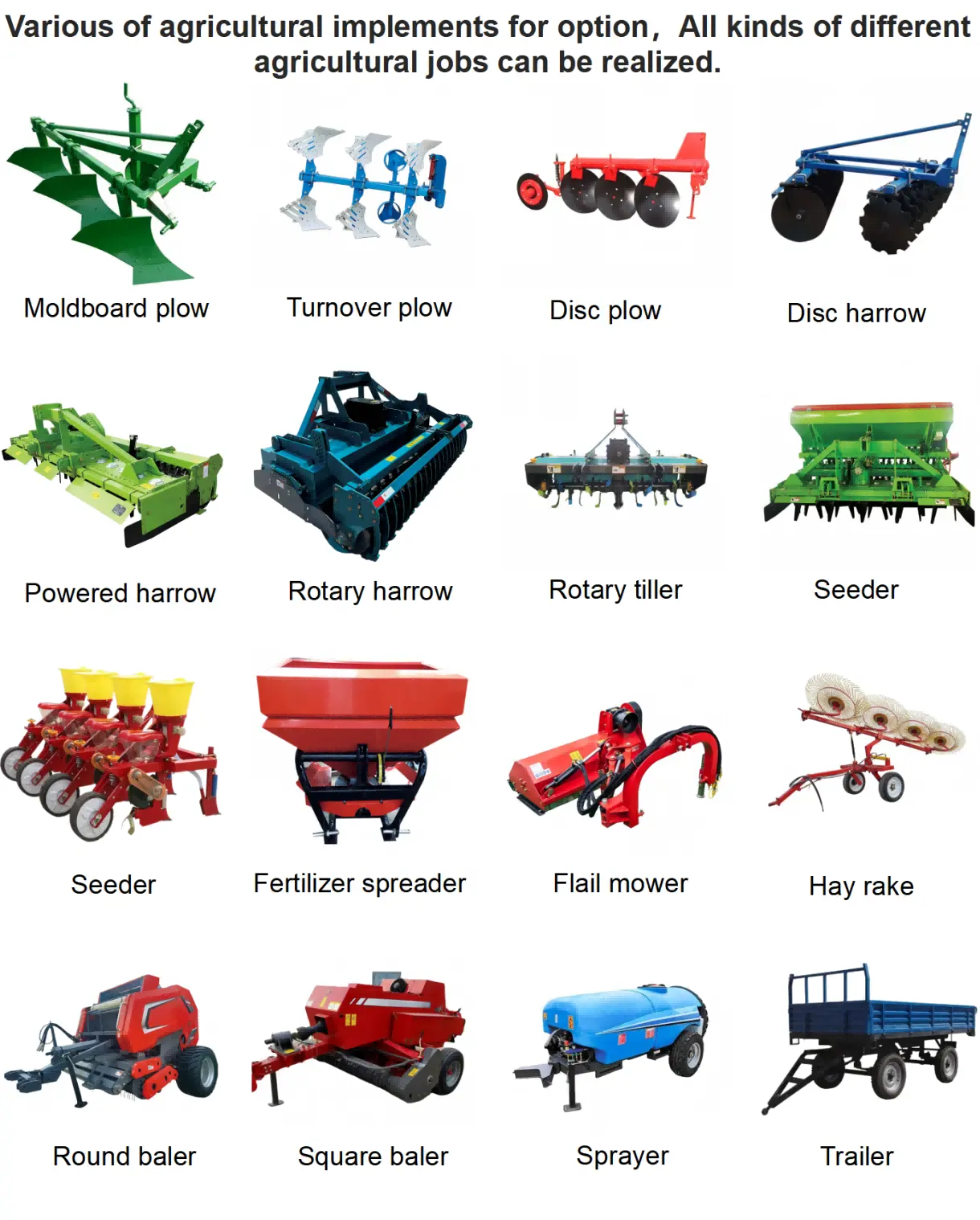 ट्रैक्टर की शक्ति सीधे तौर पर कृषि उपकरणों के प्रकार और आकार को निर्धारित करती है जिसके साथ इसे जोड़ा जा सकता है। अपर्याप्त शक्ति के परिणामस्वरूप कृषि कार्यान्वयन संचालन की दक्षता कम हो जाएगी, और यहां तक कि उन्हें मिट्टी के संचालन को सामान्य रूप से करने में सक्षम होने से भी रोका जा सकेगा; दूसरी ओर, अत्यधिक बिजली, ऊर्जा की बर्बादी का कारण बनेगी। सामान्यतया, छोटे ट्रैक्टर (15-30 हॉर्स पावर) छोटे रोटरी टिलर, सीडिंग मशीन आदि के साथ जुड़ने के लिए उपयुक्त होते हैं, और पहाड़ियों और मैदानों पर छोटे पैमाने पर रोपण के लिए उपयुक्त होते हैं; मध्यम आकार के ट्रैक्टर (30-80 हॉर्सपावर) को मध्यम आकार के मोल्डबोर्ड हल, चौड़ी पंक्ति वाले रोटरी टिलर, स्ट्रिप प्लांटर्स आदि के साथ जोड़ा जा सकता है, और मैदानी इलाकों में मध्यम पैमाने पर रोपण के लिए उपयुक्त हैं; बड़े ट्रैक्टर (80 हॉर्सपावर से अधिक) को बड़ी संयुक्त जुताई और खेती की मशीनों, चौड़ी पंक्ति वाले सीडर, संयुक्त हार्वेस्टर आदि के साथ जोड़ा जा सकता है, और बड़े पैमाने पर और गहन रोपण के लिए उपयुक्त हैं।